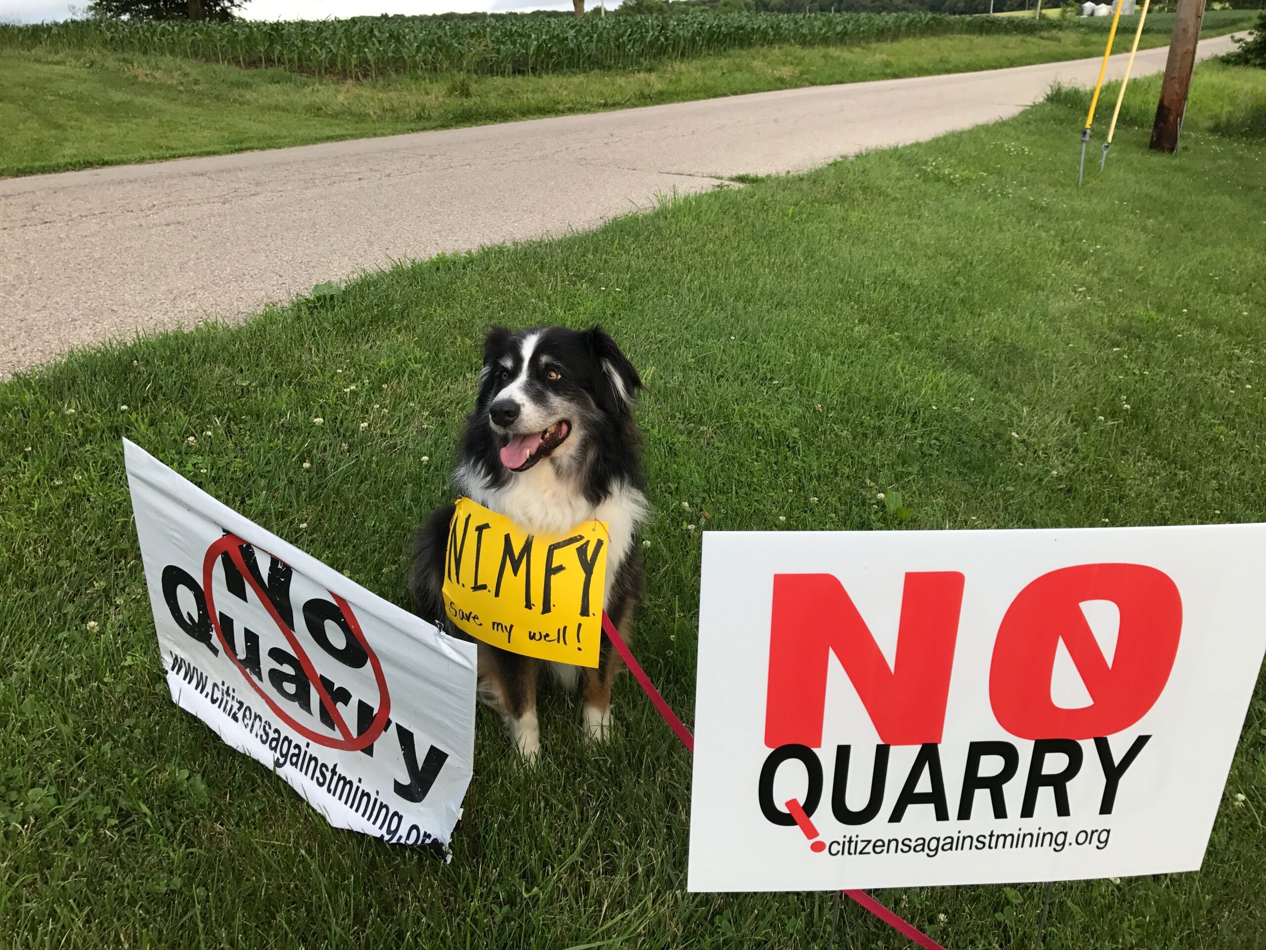 NIMFY – NOT IN MY FRONT YARD! The proposed limestone quarry land is just across the road from where Barley, the dog, is sitting. Look closely and see one of the plots of land along Garrison Road owned by Enon Sand & Gravel, a Jurgensen Company.